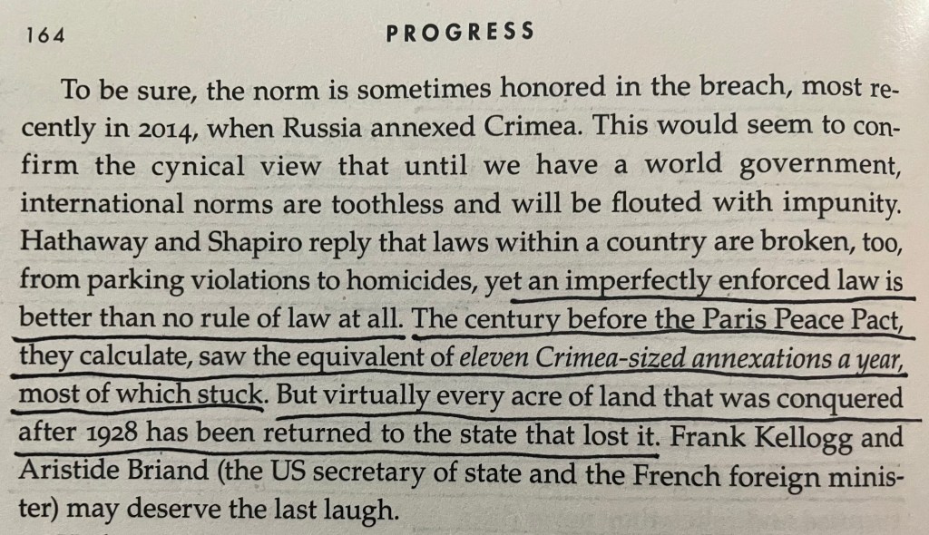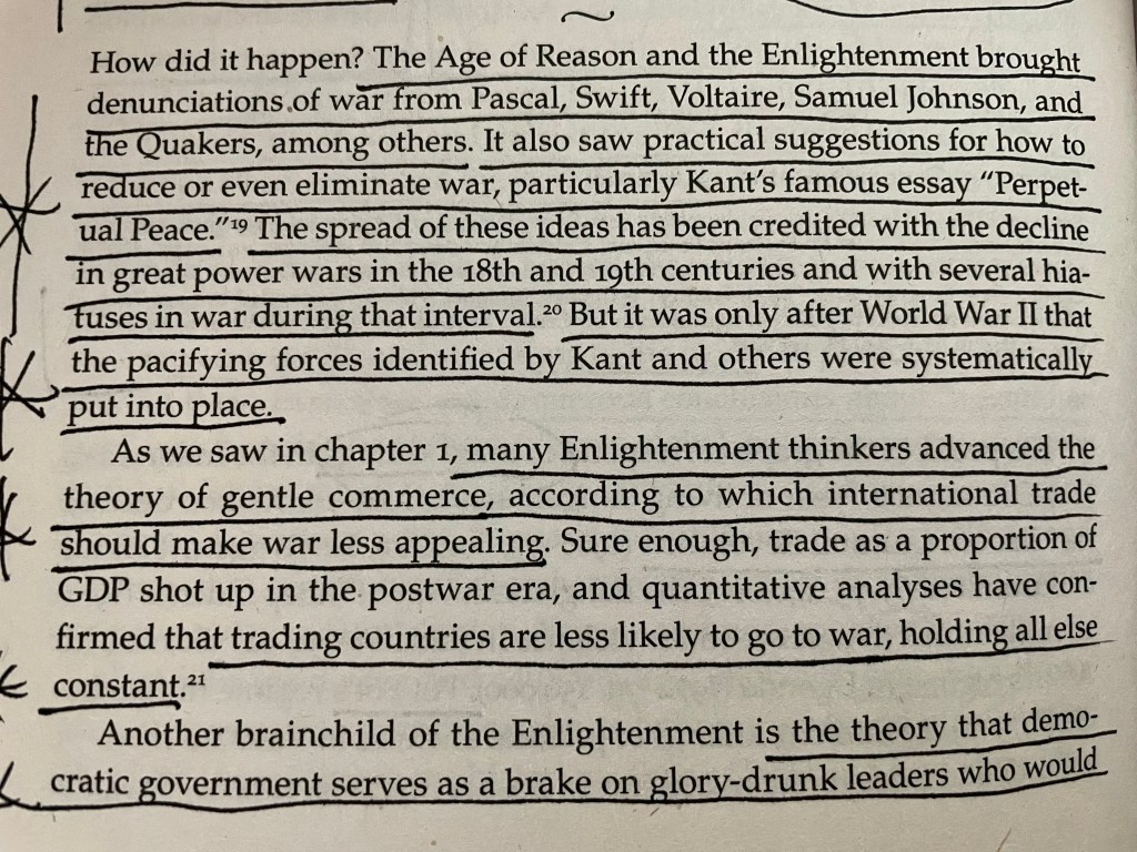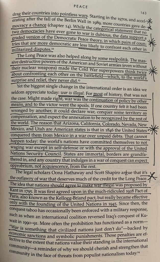 “It’s not just the great powers that have stopped fighting each other. War in the classic sense of an armed conflict between the uniformed armies of two nation-states appears to be obsolescent. There have been no more than three in any year since 1945, none in most years since 1989, and none since the American-led invasion of Iraq in 2003, the longest stretch without an interstate war since the end of World War II. Today, skirmishes between national armies kill dozens of people rather than the hundreds of thousands or millions who died in the all-out wars that nation-states have fought throughout history. The Long Peace has certainly been tested since 2011, such as in conflicts between Armenia and Azerbaijan, Russia and Ukraine, and the two Koreas, but in each case the belligerents backed down rather than escalating into all-out war. This doesn’t, of course, mean the escalation to major war is impossible, just that it is considered extraordinary, something that nations try to avoid at (almost) all costs.” (pages 157-158)